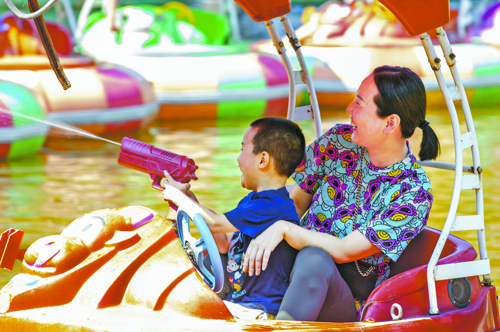 9月20日,合肥市民在安徽肥东县桥头集镇蓝山湾水上乐园玩碰碰船,乐享亲子时光。 王尚云摄(中经视觉)
