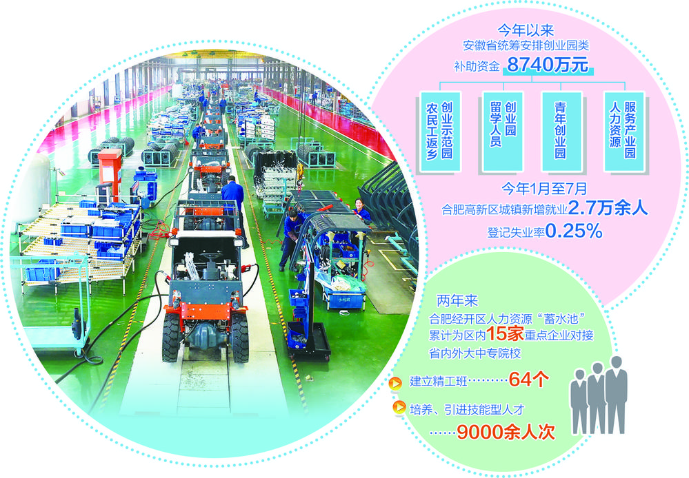 合肥经开区在2019年启动了人力资源“蓄水池”,成为安徽省首个政府主导的专项精工技能人才培养项目。两年来,“蓄水池”项目累计为区内15家重点企业对接省内外大中专院校,建立精工班64个,培养、引进技能型人才9000余人次,不仅缓解了企业用工压力,也帮助学生实现了更好的就业。
