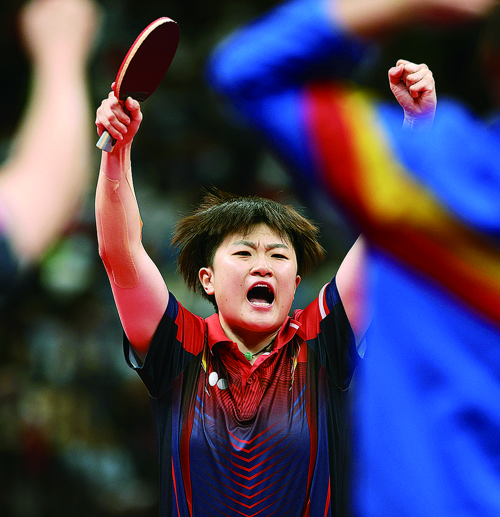 左图 9月21日,全运会乒乓球女子团体决赛中,辽宁队3比1战胜山东队获得冠军。图为辽宁队选手李佳燚在比赛中庆祝。新华社记者 张 涛摄