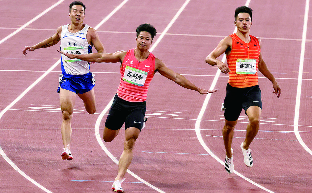 右图 9月21日,全运会田径男子百米决赛中,广东队选手苏炳添(中)以9秒95的成绩夺得冠军。本报记者 高兴贵摄