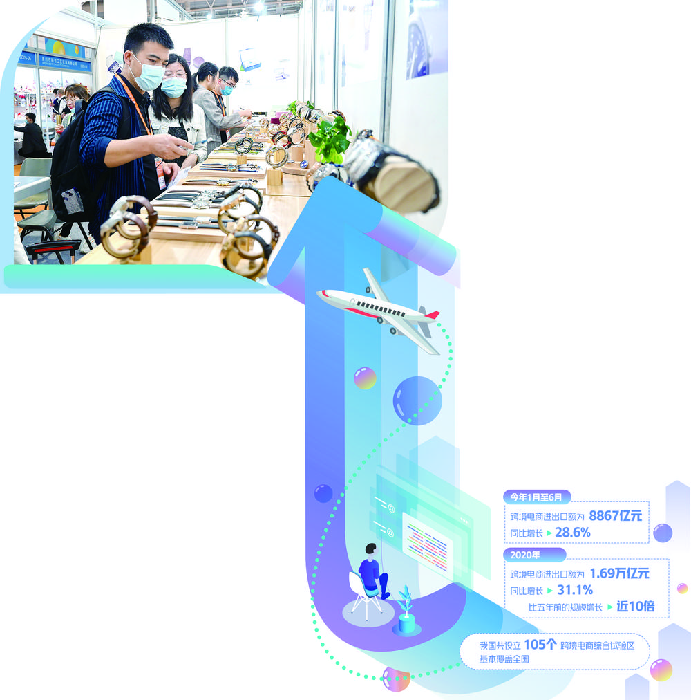 在去年新冠肺炎疫情对全球供应链和传统经贸活动造成深刻冲击的情况下,中国跨境电商逆势而上,全年实现进出口额1.69万亿元,同比增长31.1%,比五年前的规模增长了近10倍,有力支撑了我国进出口贸易增长。今年7月,国务院办公厅出台《关于加快发展外贸新业态新模式的意见》,再次释放跨境电商领域重大政策利好。