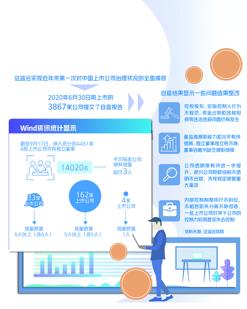 Wind资讯统计显示,截至9月17日,纳入统计的4481家A股上市公司共有独立董事14020名,平均每家公司拥有独董超过3人。其中,独董数量6人以上(含6人)的上市公司有33家,独董数量5人以上(含5人)的上市公司有162家,独董数量仅有1人的上市公司有4家。