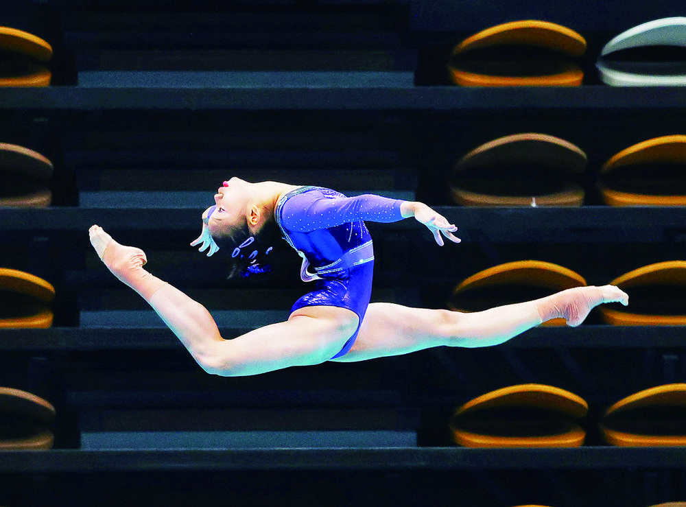 左图 9月22日,全运会体操项目女子团体决赛中,广东队以217.129分的成绩夺冠。安徽队和北京队获得亚军和季军。图为广东队队员在比赛中。本报记者 高兴贵摄