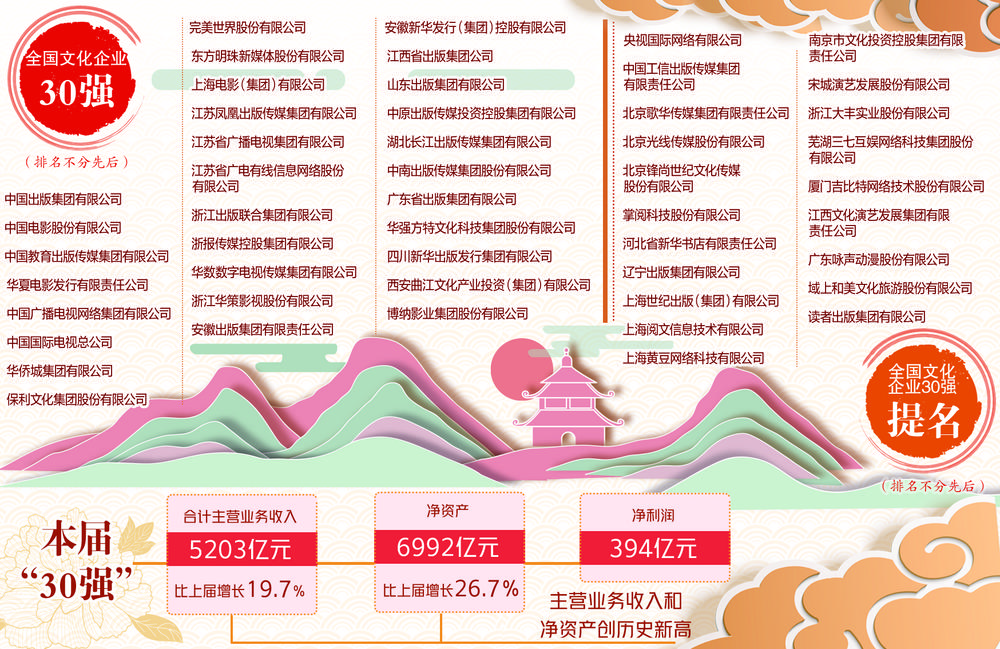 本报深圳9月23日讯(记者杨阳腾、姜天骄)9月23日,光明日报社和经济日报社在中宣部召开的文化高质量发展座谈会上联合发布了第十三届“全国文化企业30强”名单。中国出版集团有限公司等30家企业进入行列。从本届“30强”企业有关情况看,过去一年,面对国内外形势的深刻变化,面对新冠肺炎疫情的严重冲击,骨干文化企业坚持把社会效益放在首位、实现社会效益和经济效益相统一,深化改革创新,加快转型升级,总体规模实力进一步壮大,市场竞争力进一步增强,体现出文化产业持续健康发展、新业态新模式不断涌现、发展新动能更加强劲的良好势头。本届“30强”2020年度合计主营收入5203亿元、净资产6992亿元、净利润394亿元,主营业务收入和净资产均创历史新高,分别比上届“30强”增长19.7%和26.7%,且主营业务收入首次突破5000亿元大关,净资产首次突破6000亿元大关。