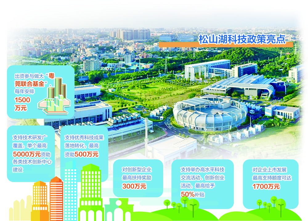 比如,这是松山湖首次针对源头创新出台扶持政策,力度相当大。每年安排1500万元资金,依托“粤莞联合基金”,省市区三级联动支持基础与应用基础研究;每年安排500万元,设立大科学装置开放课题,开展多学科交叉研究。同时,为加速科技成果转化,对于围绕主导产业建设的共性技术平台和中试验证基地,最高资助金额达到5000万元。
