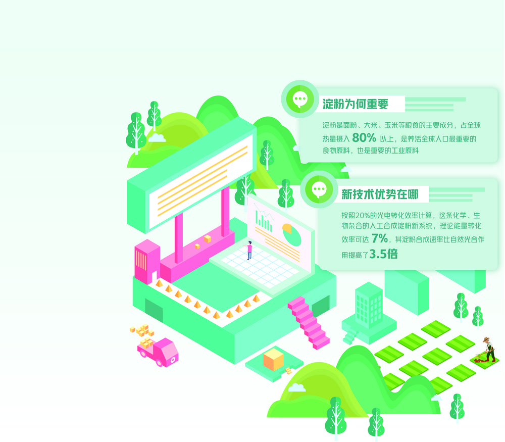 设想一下,不需要种地,也不需要绿色植物,以太阳光、水和二氧化碳为原料,在工厂里就可以像植物一样源源不断生产出淀粉。是不是很神奇?而今,这看似遥不可及的一幕,在不久的将来,有望实现。