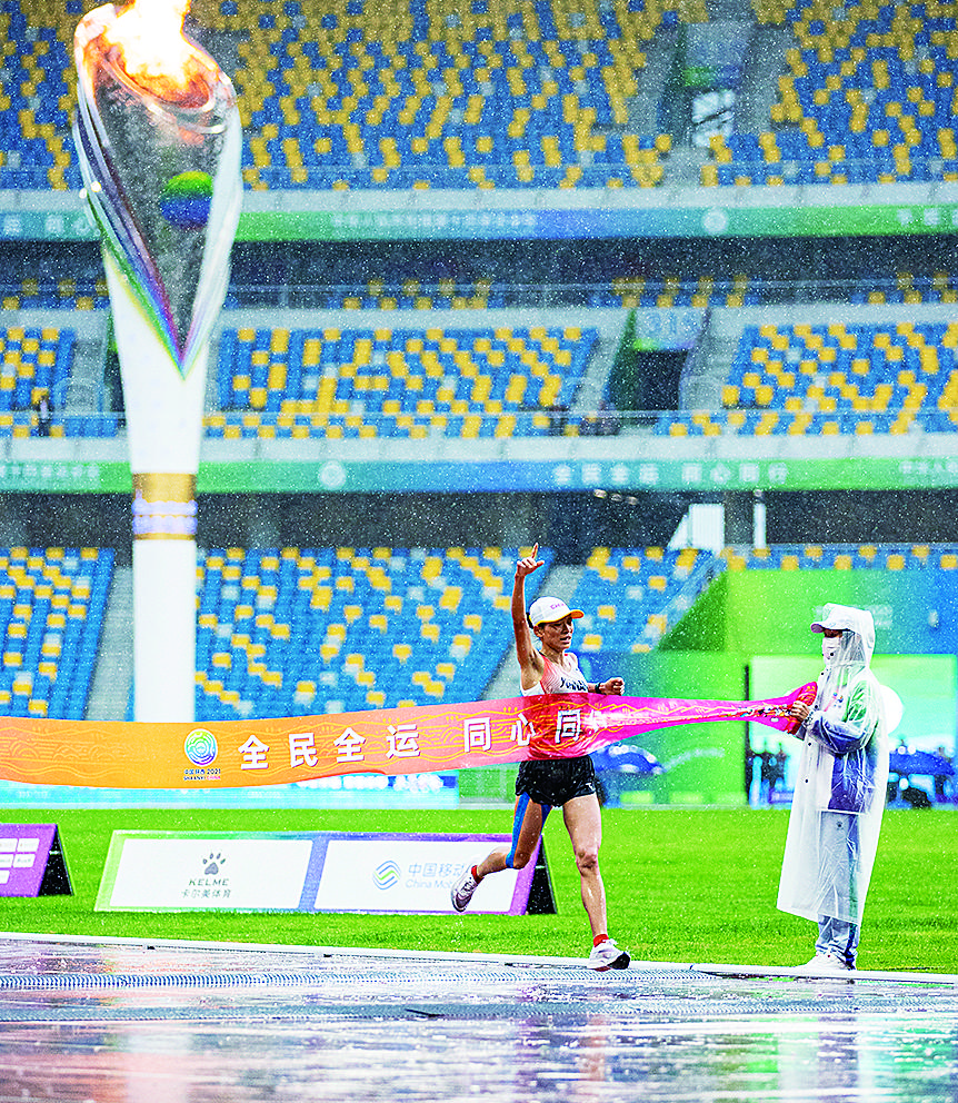 左图 9月26日上午,全运会女子马拉松决赛在雨中进行,云南名将张德顺以2小时32分31秒的成绩夺得冠军。图为张德顺向比赛终点冲刺。