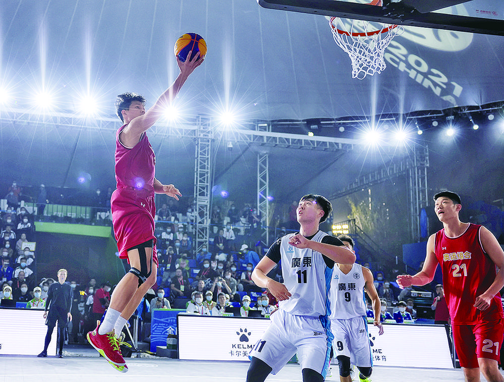 右图 9月26日,全运会男子三人篮球决赛,联合队以21比12的比分战胜广东队,并以九连胜的战绩夺得金牌。图为双方队员在比赛中。