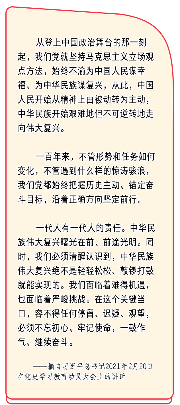 党的百年历史是一部始终为民族谋复兴的历史。习近平总书记在庆祝中国共产党成立100周年大会上强调:“中国共产党一经诞生,就把为中国人民谋幸福、为中华民族谋复兴确立为自己的初心使命。一百年来,中国共产党团结带领中国人民进行的一切奋斗、一切牺牲、一切创造,归结起来就是一个主题:实现中华民族伟大复兴。”回顾过往百年奋斗路,中国共产党带领人民接续奋斗、不懈探索,实现了第一个百年奋斗目标,在中华大地上全面建成了小康社会。眺望前方奋进路,我国正向着全面建成社会主义现代化强国的第二个百年奋斗目标迈进。在实现中华民族伟大复兴的关键阶段,必须把党的历史学习好、总结好,把党的成功经验传承好、发扬好,从百年党史中汲取实现中华民族伟大复兴的不竭动力。