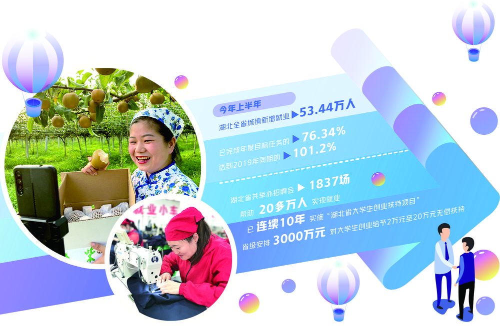 “今年上半年,湖北全省城镇新增就业53.44万人,已完成年度目标任务的76.34%,达到2019年同期的101.2%。”湖北省人力资源和社会保障厅有关负责人表示,湖北省已于8月3日启动高校毕业生就业创业服务月活动,通过湖北公共招聘网开展线上招聘,组织390家企业提供11730个岗位,宜昌、襄阳、黄石等9市还组织111家企业直播“带货”岗,搭建人才供需对接平台。