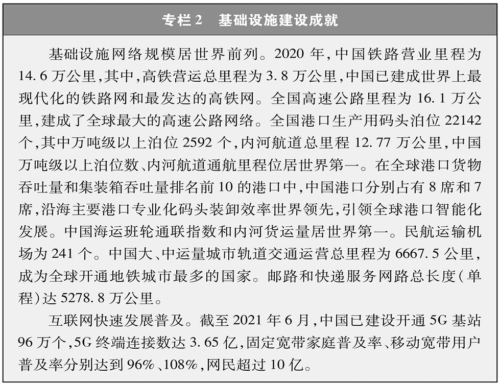 现代基础设施网络持续完善。信息畅通、公路成网、铁路密布、大桥巍峨,天涯成咫尺,天堑变通途(专栏2)。“五纵五横”综合运输大通道基本贯通,高速铁路、高速公路、城市轨道交通运营总里程和港口深水泊位数量均居世界第一,民航运输总周转量连续多年位居世界第二,中国加快向交通强国迈进。四通八达的交通网络深刻影响了城市格局、人口布局和经济版图,深刻改变了人们的生活圈、工作圈。能源供给保障能力和能源开发技术水平持续提升,能源开发效率明显提高,基本形成煤、油、气、核和可再生能源多轮驱动高质量发展的能源生产体系。水利基础设施不断完善,中国以占世界6.6%的淡水资源支持和保障了占世界近20%的人口和17%的经济总量。互联网基础设施建设加速推进,网络覆盖越来越广、资费越来越低、网速越来越快,随时随地可以一键互联、一“网”打尽,信息高速路畅通了人民幸福路。