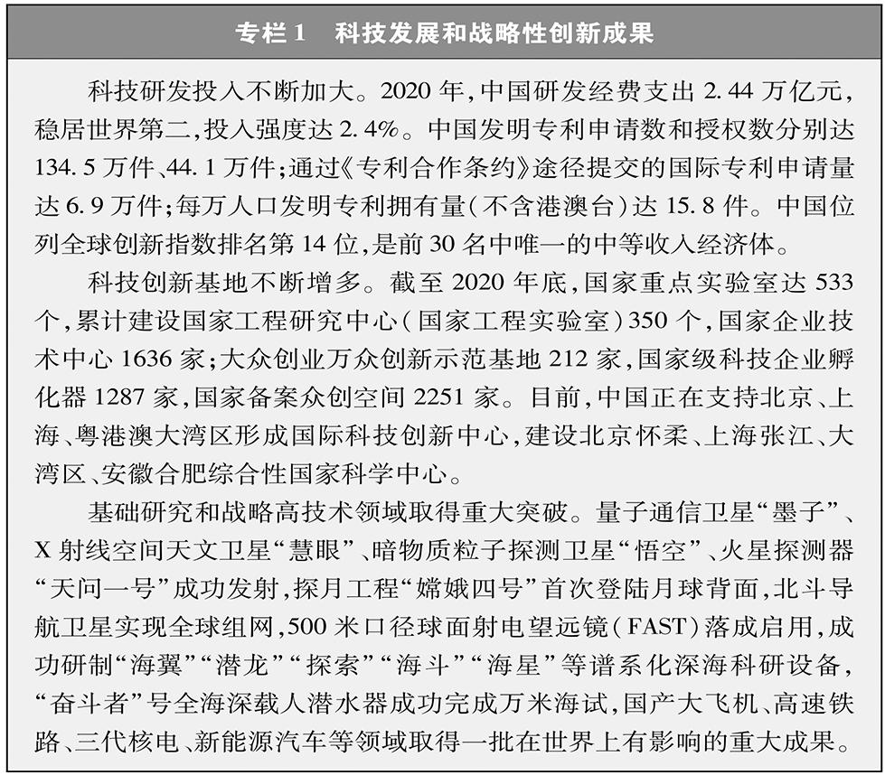科技实力跨越式发展。科技支撑起小康梦。从新中国成立初期连火柴、铁钉都要依靠进口,到量子信息、铁基超导、中微子、干细胞、脑科学等前沿方向取得一系列重大原创成果,到载人航天与探月、北斗导航、载人深潜、高速铁路、5G移动通信、超级计算等一大批战略高技术领域取得重大突破,中国跻身创新型国家行列,正在从科技大国迈向科技强国(专栏1)。科技广泛应用于生产领域,创新驱动发展成效显著,科技进步贡献率超过60%。科技显著提升治理水平,数字政府、数字社会、数字乡村、智慧城市、“互联网+政务服务”等加快普及,网格化网络化智能化治理渐成常态。科技深刻改变人们的生活,网络点餐购物、移动扫码支付、网约车出行、共享单车出行、线上办公、在线教育、远程医疗、智能家居等,给人们带来的不仅是更多的便利,还有更充分的自由、更全面的发展。