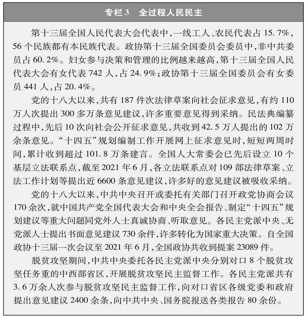 人民享有广泛民主权利。在中国,国家一切权力属于人民。人民依法实行民主选举、民主协商、民主决策、民主管理、民主监督(专栏3)。在中国,年满18周岁、具有中华人民共和国国籍、依法享有政治权利的公民,都有选举权和被选举权。坚持普遍、平等、直接选举和间接选举相结合以及差额选举、无记名投票的原则,依法保障人人享有平等的选举权利。社会主义协商民主广泛多层制度化发展,人民通过各种途径、渠道、方式,就改革发展稳定重大问题,特别是事关人民切身利益的问题广泛协商,找到全社会意愿和要求的最大公约数。党和国家制定实施重大决策,广泛征求和听取各方面意见,最大限度吸纳民意、汇集民智、凝聚民力,努力实现决策科学化民主化。人民广泛、直接参与社会事务管理,实现自我管理、自我服务、自我教育、自我监督。人民依照宪法和法律规定,有权对国家机关和国家工作人员提出批评和建议,有权对国家机关和国家工作人员的违法失职行为提出申诉、控告或者检举。民主选举、民主协商、民主决策、民主管理、民主监督各个环节环环相扣、彼此贯通,实现过程民主和结果民主、形式民主和实质民主、直接民主和间接民主相统一,保障了人民的知情权、参与权、表达权、监督权。