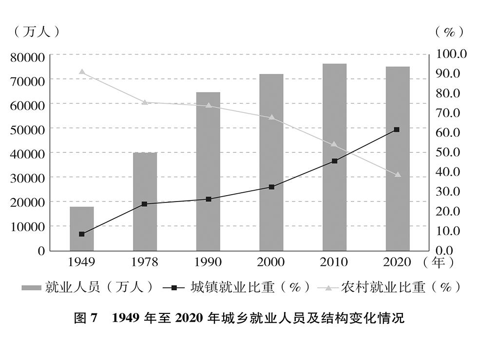 就业局势长期稳定,就业质量显著提升。就业人数从1949年的1.8亿增加到2020年的7.5亿,就业规模不断扩大;从绝大多数劳动者以农业为生到第三产业就业人数占47.7%(图6)、城镇就业人数占61.6%(图7),就业结构不断优化;从劳动者普遍处于文盲半文盲状态到劳动年龄人口平均受教育年限10.8年、技能人才总量约2亿,就业人员素质大幅提高。亿万劳动者拥有自己热爱的工作,开启幸福生活的大门。从计划分配到市场就业、自由择业、自主创业,从传统就业方式到新就业形态,劳动者的就业观念深刻变革、就业空间更加广阔、就业方式日益多元。人们的兴趣爱好、特长禀赋与个人就业意愿、社会需求、国家需要更好结合,自我价值更好实现,主动性创造性显著增强,创新创造热情不断迸发。劳动者合法权益得到保障,劳动报酬保持增长,劳动所得受到保护,人们越来越有尊严地劳动、快乐地劳动,依靠自己的双手创造美好生活。从“单休制”到“双休制”,从“黄金周”到带薪年休假,劳动者休息休假权益越来越有保障,工作生活更加平衡。劳动最光荣、最崇高、最伟大、最美丽日益成为全社会的共识和行动,勤奋做事、勤勉为人、勤劳致富成为风尚,崇尚劳动、尊重劳动、热爱劳动的社会氛围更加浓厚。