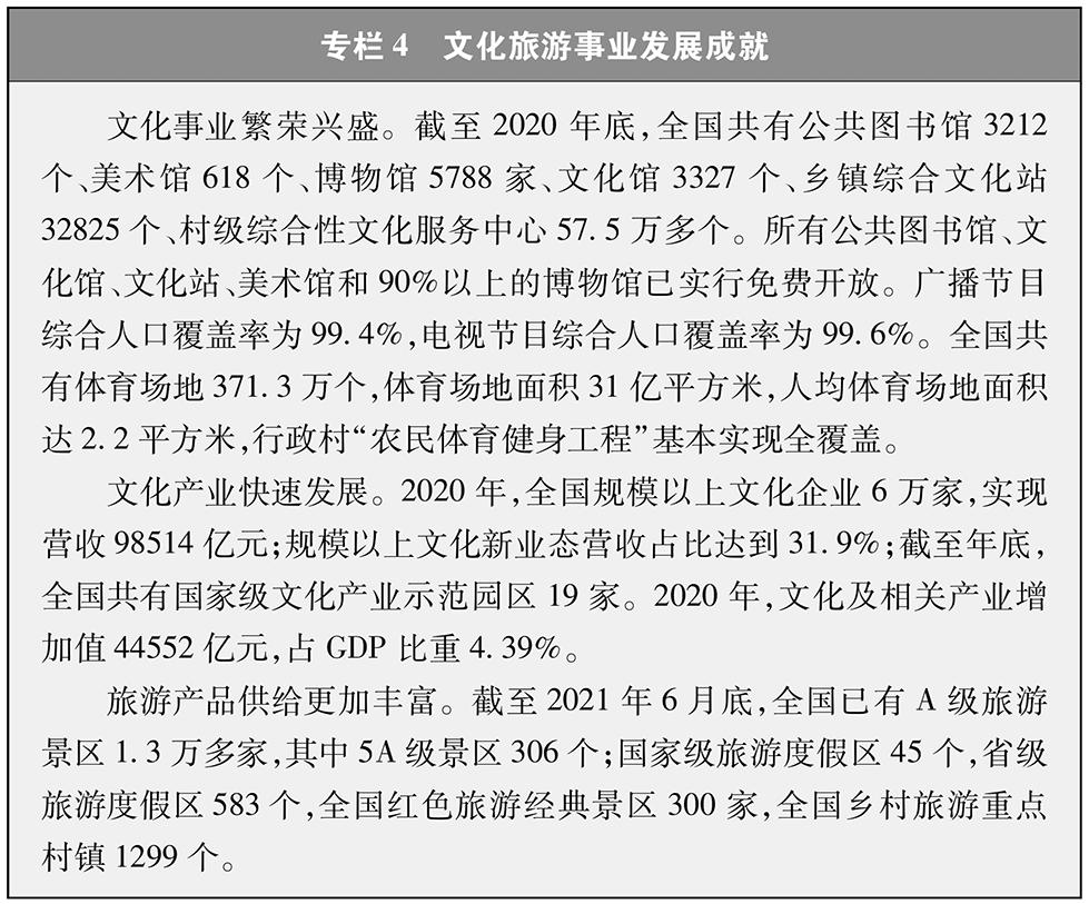 文化产业持续健康发展,新型文化企业、文化业态、文化消费模式加速形成,网络文化产业迅猛发展,时尚的文化场馆、高质量的文化产品、具有创意的文化活动更好满足人们个性化多样化品质化国际化的文化需求。影视出版繁荣发展,“暑期档”“国庆档”“春节档”大片云集,精品图书不断呈现,人们享受越来越多的高品质文化盛宴。文化娱乐领域乱象有效整治,天清气朗风气正在形成。中外文化交流日益扩大,人们不出国门也能欣赏世界顶级文艺演出。文化与旅游融合发展,旅游景区、休闲度假、乡村旅游、红色旅游等旅游产品文化内涵不断提升,成为传播社会主义核心价值观的重要渠道、满足人民群众文化和旅游消费需求的重要方式、展示美丽中国的重要窗口,人们在行走中华大地、领略大好河山中感悟中华文化之美、陶冶心灵情操。全民健身热悄然兴起,从竞技体育到群众性体育活动,从国际赛事摘金夺银到闲暇时跳起欢快的广场舞,全民健身强健着民族筋骨、强大着民族力量,中国正在从体育大国迈向体育强国。