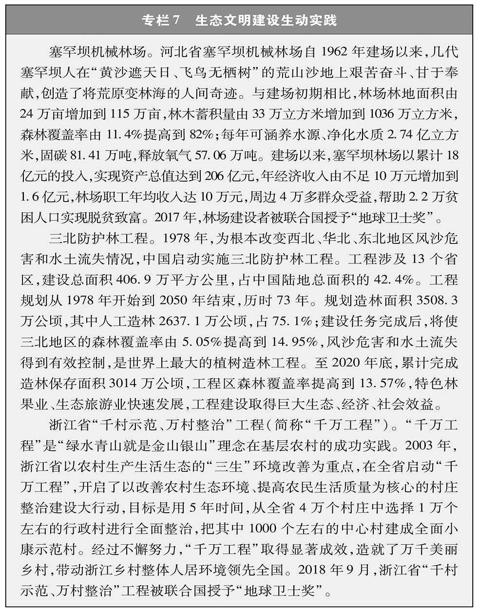 生态系统质量和稳定性不断提升。坚持系统观念,坚持节约优先、保护优先、自然恢复为主,统筹山水林田湖草沙一体化保护和系统治理,增强生态系统整体性,完善自然保护地、生态保护红线监管制度,筑牢国家生态安全屏障,促进生态环境持续改善,让中华民族在绿水青山中永续发展(专栏7)。全民义务植树持续开展40年,全国动员、全民动手、全社会共同参与,植树造林、绿化祖国成为全社会自觉行动。全国人工林面积扩大到11.9亿亩,不毛之地变成绿洲,黄土高坡披上绿装,中国成为全球森林资源增长最多和人工造林面积最大的国家。2020年底,全国森林覆盖率达到23.04%,草原综合植被覆盖度达到56.1%,湿地保护率达到50%以上。探索建立生态保护红线制度,生物多样性保护得到加强,各级各类自然保护地占到陆域国土面积的18%,山清水秀、小溪潺潺、草绿花红、鸟鸣虫吟的自然生态景观越来越多。国家森林城市创建持续推进,468个城市开展了国家森林城市建设,“让森林走进城市,让城市拥抱森林”逐渐成为现实。以国家园林城市创建为抓手,大力推动城市园林绿化,城市建成区绿地率达到38.24%,人均公园绿地面积达到14.78平方米。一个善待自然、青山常在、绿水长流、空气常新、人与自然和谐共生的美丽中国正越来越清晰起来。