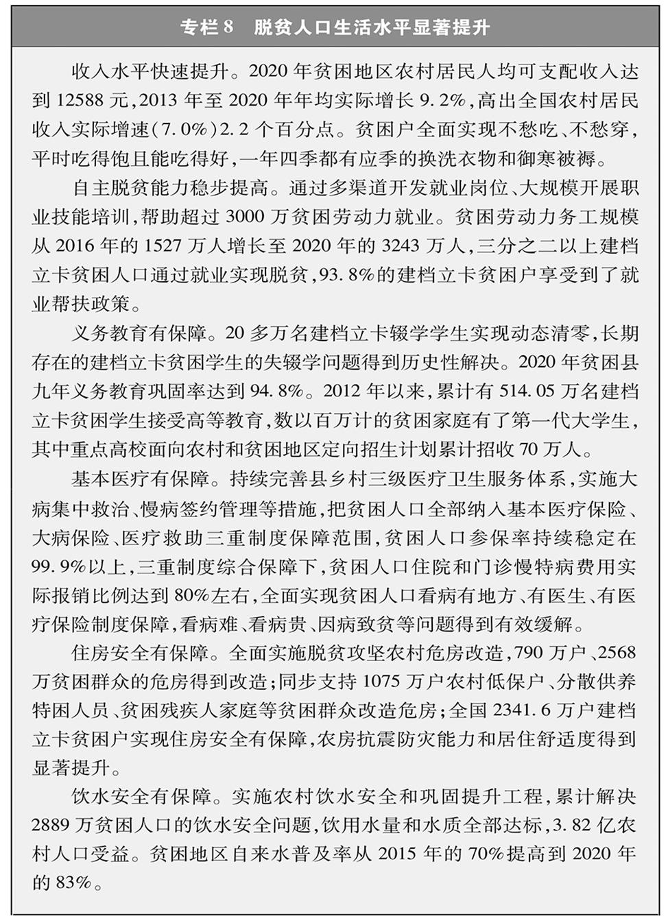 贫困群众与全国人民一道迈进小康。实施精准扶贫方略,做到扶持对象、项目安排、资金使用、措施到户、因村派人、脱贫成效“六个精准”,实施发展生产、易地搬迁、生态补偿、发展教育、社会保障兜底“五个一批”。到2020年底,中国如期完成新时代脱贫攻坚目标任务,现行标准下9899万农村贫困人口全部脱贫,832个贫困县全部摘帽,12.8万个贫困村全部出列。少数民族和民族地区脱贫攻坚成效显著,到2020年底,内蒙古自治区、广西壮族自治区、西藏自治区、宁夏回族自治区、新疆维吾尔自治区和贵州、云南、青海三个多民族省份3121万贫困人口全部脱贫;28个人口较少民族全部实现整族脱贫,一些新中国成立后“一步跨千年”进入社会主义社会的“直过民族”,又实现了从贫穷落后到全面小康的第二次历史性跨越。农村建档立卡贫困人口的收入和福利水平大幅提高,“两不愁三保障”全面实现,教育、医疗、住房、安全饮水等条件明显改善,既满足了基本生存需要,也为后续发展奠定了基础(专栏8)。从2016年起,通过大力实施易地扶贫搬迁,960多万居住在“一方水土难养一方人”地方的建档立卡贫困人口告别穷山恶水之地,易地搬迁,实现了脱贫。脱贫攻坚唤醒了贫困群众对美好生活的追求,提振和重塑了自力更生、自强不息、勤劳致富、勤俭持家、创业干事、创优争先的精气神,增强了脱贫致富的信心和劲头。脱贫攻坚任务目标完成后,对脱贫地区、脱贫人口实施跟踪监测,设立一定过渡期保持帮扶政策总体稳定,定期检查、动态管理,早发现、早干预、早帮扶,提升脱贫地区自主发展能力,激活脱贫人口自我发展动力,确保稳定脱贫、防止返贫。