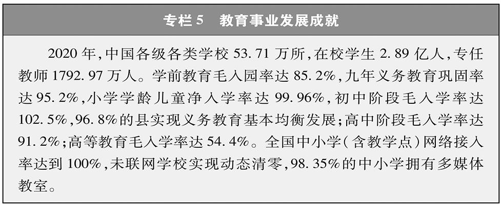 教育事业蓬勃发展。从文盲半文盲大国到教育大国、迈向教育强国,从人口大国到人力资源大国、迈向人力资源强国,中国已建成包括学前教育、初等教育、中等教育、高等教育等在内的当代世界规模最大的教育体系,教育现代化发展总体水平跨入世界中上国家行列(专栏5,表1)。学前教育普及率、普惠率超过84%,九年义务教育巩固率达到95%以上,高中阶段教育全面普及,区域、城乡、校际教育差距逐步缩小,从“有学上”到“上好学”、从“学有所教”到“学有优教”,中国基础教育跨越式发展,让每个孩子都能享有公平而有质量的教育正在变为现实。中国高等学校累计培养近亿名高素质专门人才,高等教育进入普及化阶段,教育水平跃升至世界中上国家水平。职业技术教育不断发展,为经济社会发展输送大量高素质技能人才,培养越来越多的能工巧匠、大国工匠。特殊教育从无到有、加快发展,残疾人享有平等受教育权正在实现。网络化、数字化、个性化、终身化的学习体系加快构建,“人人皆学、处处能学、时时可学”的学习型社会正在形成,学习逐渐成为人们的日常习惯和生活方式。中国的教育,畅通了向上流动的通道,改变了无数人的命运,实现了无数人的梦想,让人们拥有更多人生出彩的机会。