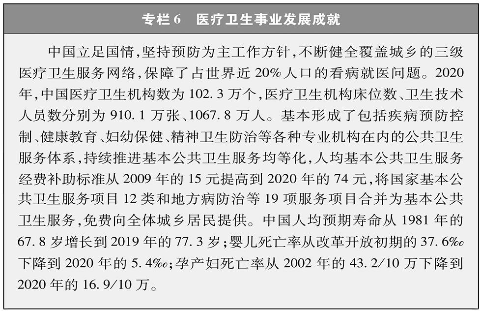 全民健康托起全面小康。新中国成立以来,从疫病横行到可防可控,从缺医少药到病有所医,从只能本地报销到逐步异地结算,从单纯医院就医到家庭医生签约服务覆盖面不断扩大,中国医疗卫生体系逐步健全,医疗资源配置进一步优化,人们看病难、看病贵的问题逐步得到缓解(专栏6)。医疗技术水平和服务能力不断提升,“互联网+医疗健康”持续发展,医药价格逐步回归合理水平,越来越多的常用药、救命药纳入医保目录,人民群众看得上病、看得起病、看得好病。城乡基本医疗公共服务均等化不断推进,农村医疗卫生服务体系持续改善,医疗保障制度不断健全,农村居民看病就医有地方、有医生、有保障,因病致贫、因病返贫问题得到有效解决。健康中国行动加快推进,全民健身和全民健康持续融合,有利于健康的生活方式、生产方式、经济社会发展模式和治理模式正在形成。人民健康水平不断提升,从新中国成立之初处于世界平均水平到现在处于中等收入国家前列。中国取得抗击新冠肺炎疫情重大战略成果,中国医疗卫生体制的优越性进一步彰显,人民生命健康得到有效维护。