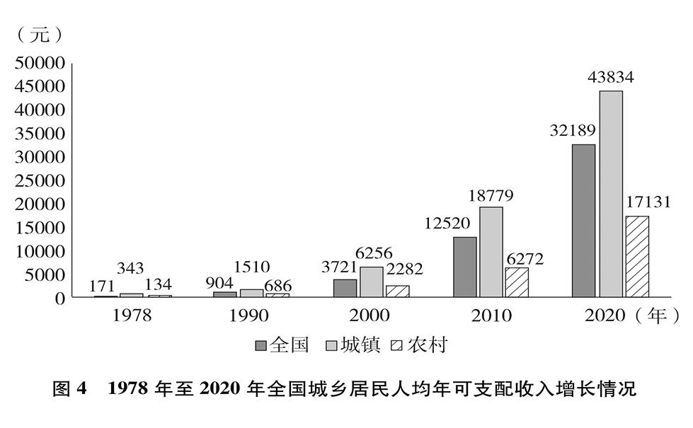 人民生活水平显著提高。居民收入持续增加,全国居民人均年可支配收入从1978年的171元增加到2020年的32189元(图4)。城乡居民恩格尔系数分别从1978年的57.5%、67.7%下降到2020年的29.2%、32.7%(图5),城乡居民生活质量不断提升。温饱问题解决后,人们对生活品质、品位有了更高的追求,衣食住行不断升级,消费结构从生存型逐渐向发展型、享受型过渡。衣,从穿暖到穿美、穿出时尚;食,从吃饱到吃好、吃出健康;住,从有所居到更敞亮、更宜居;行,从便利通畅到快捷舒适。吃穿用有余,家电全面普及,乘用汽车快速进入寻常百姓家。餐饮、健康、教育、旅游、文娱等服务性消费持续快速增长,在居民人均消费支出中占比逐渐达到一半左右。越来越多的人有“钱”有“闲”,“诗和远方”更加触手可及,“说走就走”不再是梦想,旅游扮靓人们的幸福生活,中国正在进入大众旅游时代。