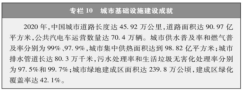 城镇化水平持续提高。城镇化是现代化的必由之路,是实现全面小康的幸福之路。新中国成立前,中国大地上城镇寥若晨星、衰败破落;今天的中国,城镇繁星璀璨、繁华时尚。中国经历了世界近现代史上规模最大、速度最快的城镇化进程,从1949年至2020年,常住人口城镇化率由10.6%提高到63.9%,城市数量由132个增长到687个,建制镇数量由2000个增长到2.1万多个。现代化国际化的大都市、厚重雍容的历史古都、典雅精致的文化名城、类型迥异的特色小镇,星罗棋布,城城不同,风景各异。城镇化的加快推进,形成了面积庞大、人口众多、联系紧密的城市群,成为经济发展和现代化建设的重要载体,提升了城市运行效率和居民生活质量。中国基本形成以城市群为主体、都市圈为依托,大中小城市和小城镇协调发展的城镇体系。