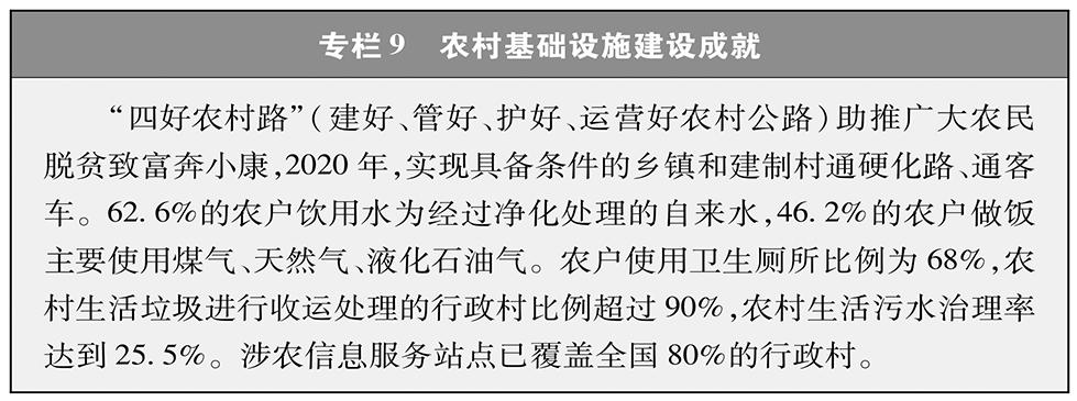 新型工农城乡关系加快形成。城市的发展,辐射和带动了乡村的发展;乡村的振兴,支持和促进了城市的发展。城乡劳动力、资本、技术、数据等要素流动更加畅通,城市落户限制逐步消除,促进城市人才、资本、科技入乡政策建立健全,农村农业发展潜力进一步释放。户籍制度改革不断深化,城乡统一的户口登记制度全面建立,农业转移人口城镇化进程不断加速。2016年至2020年,约1亿左右农业转移人口在城镇落户。居住证制度全面实行,义务教育、医疗卫生、技能培训、社会保障等基本公共服务加快覆盖城镇常住人口。农村居民在城乡之间发展空间越来越大,可以安稳留乡,有地种、有房住;可以踏实进城,能就业、有收入;可以返乡创业,有平台、有政策。城乡居民收入差距进一步缩小,城乡居民人均可支配收入比值自2008年以来连续13年平稳下降,2020年为2.56∶1。城乡基础设施建设向着联通化、一体化的方向加快迈进,交通运输更加便捷顺畅,畅通了工业品下乡、农产品进城双向流通渠道,有效促进了农民增收。县城短板弱项加快补齐,越来越多的农民选择到县城安家置业。农家乐、生态游、乡村民宿蓬勃发展,越来越多的城市居民到乡村休闲度假,越来越多的进城务工人员返乡创业,为乡村振兴提供了新动能。今天的中国城镇,为农业农村发展提供人才、资金、科技支撑,不断满足农村居民日益增长的消费需求,为进入城镇的农村居民提供越来越多的就业机会和越来越完善的基本公共服务。今天的中国乡村,不仅是城市的“米袋子”“菜篮子”,让城市居民吃得更好、更健康,而且为城市发展输送更多建设者、提供庞大消费市场,吸引着越来越多的城市居民到乡村就业创业。工农互促、城乡互补、协调发展、共同繁荣的新型工农城乡关系正在加快形成。