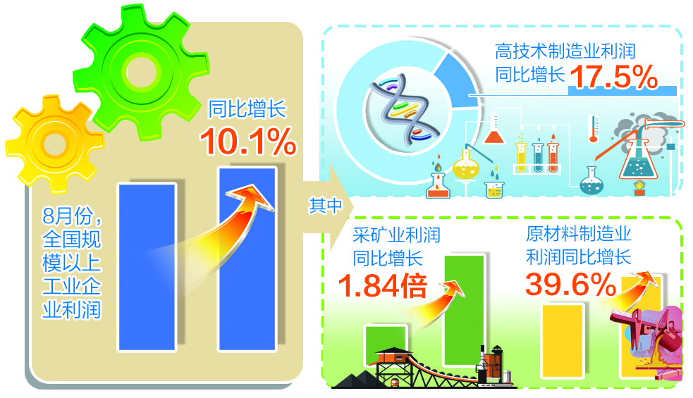 8月份,采矿业、原材料制造业利润同比分别增长1.84倍、39.6%,均明显高于规模以上工业平均水平;两年平均分别增长58.1%、36.0%,增速较上月分别加快24.0个和4.4个百分点。其中,受大宗商品价格总体高位运行推动,煤炭行业利润同比增长2.41倍,增速较上月加快30.0个百分点;油气开采行业利润同比增长2.57倍;有色、化工行业利润分别增长98.9%、66.5%。