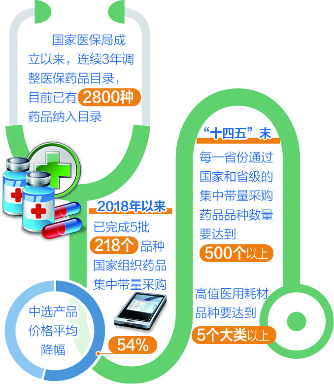《规划》提出,到“十四五”末期,每个省份通过国家和省级的集中带量采购药品品种数量要达到500个以上,高值医用耗材的品种要达到5个大类以上。“十四五”时期,国家医保局将进一步扩大药品和高值医用耗材集采范围,让群众用上更多新药好药。