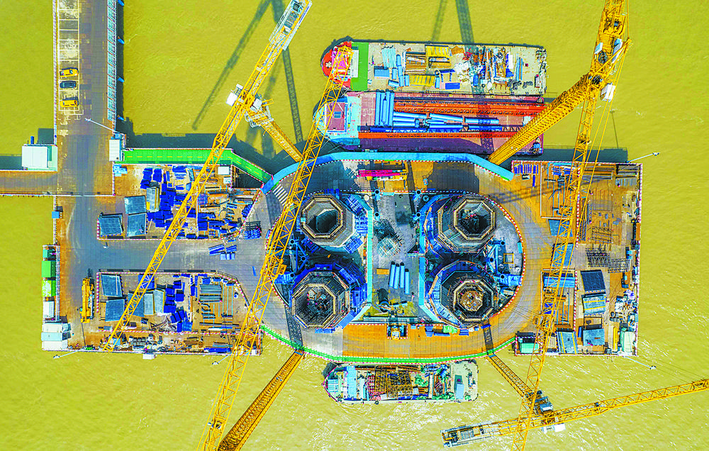 10月1日,在江苏泰州常泰长江大桥建设工地,工人正对5号墩主塔下塔柱进行钢筋绑扎施工。 汤德宏摄(中经视觉)