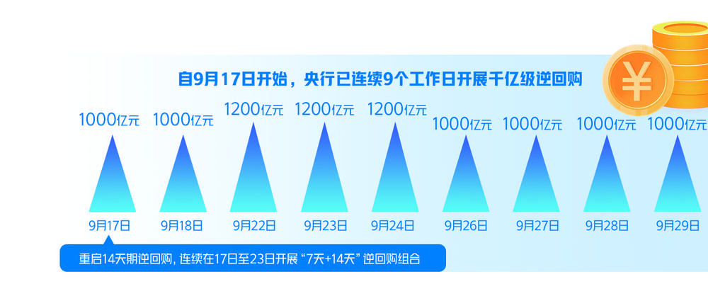 自9月17日开始,央行已连续9个工作日开展千亿级逆回购。此前央行分别于9月17日、18日、22日、23日、24日、26日、27日、28日开展了1000亿元、1000亿元、1200亿元、1200亿元、1200亿元、1000亿元、1000亿元、1000亿元逆回购操作,并于9月17日重启14天期逆回购,连续在17日至23日开展“7天+14天”逆回购组合。