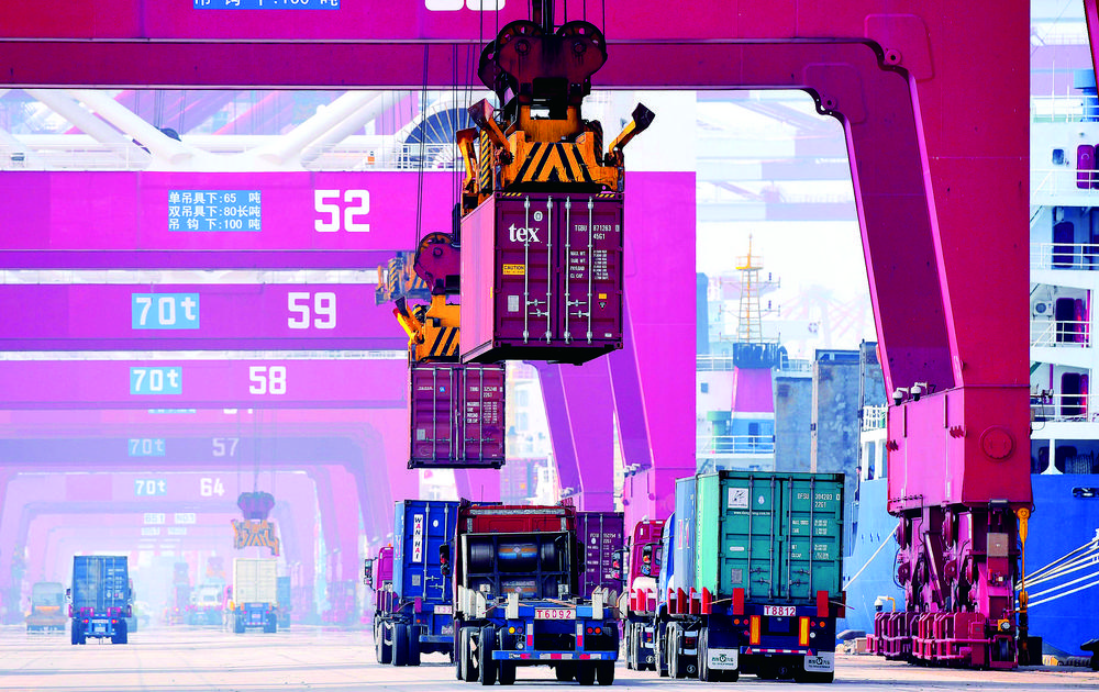 10月2日,山东港口青岛港外贸集装箱码头,货轮在装卸集装箱。国庆长假期间,青岛港生产依然繁忙,进出港口的货轮不断,运送集装箱的车辆在集装箱堆场与码头间川流不息。港口各部门加强调度协调,统筹做好疫情防控和安全生产,持续优化服务,满足外贸企业需求。俞方平摄(中经视觉)