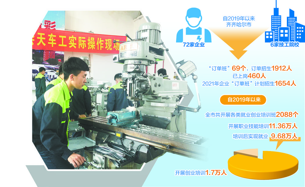 数据显示,自2019年以来,齐齐哈尔共有6家技工院校同72家企业开设“订单班”69个,订单招生1912人,已上岗460人,今年企业“订单班”计划招生1654人。齐齐哈尔还对技工院校学生实行免学费、提供奖助学金等“五免一助”政策,在一定程度上吸引了青年人进入技工院校学习。