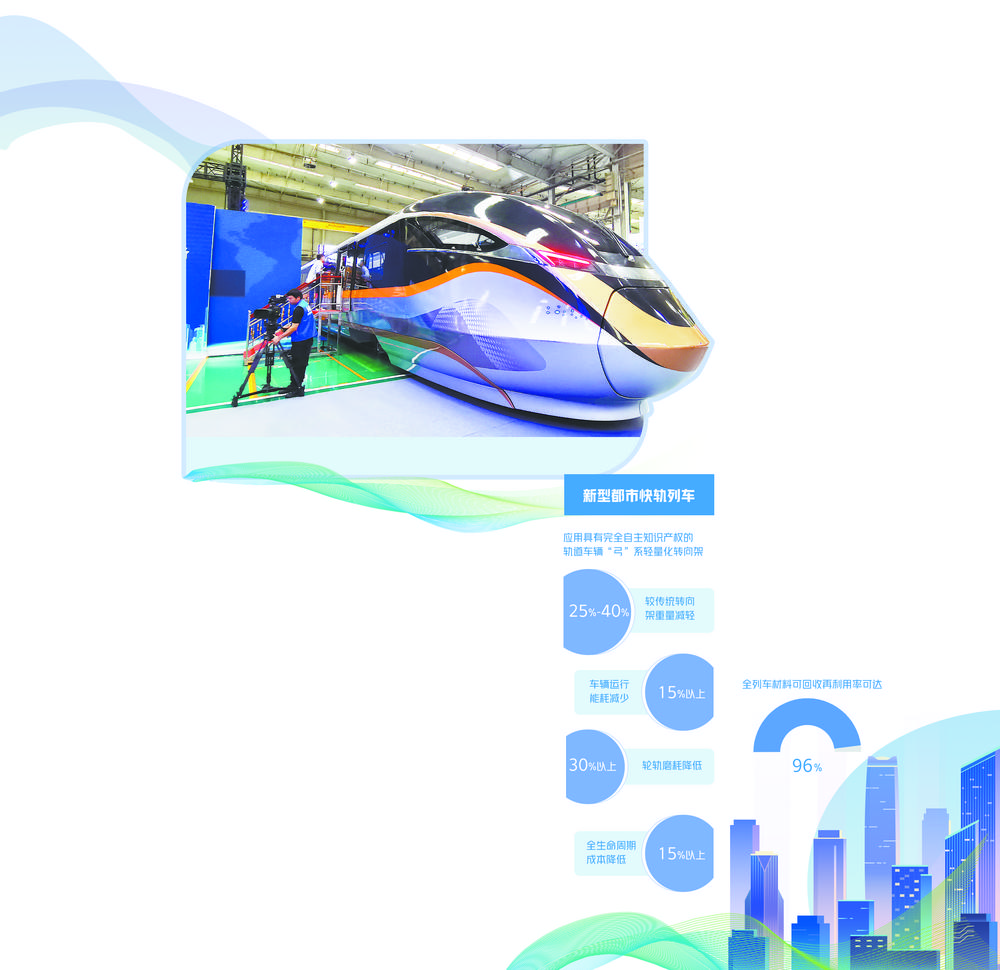 为实现碳达峰、碳中和目标,环保水平也成为判断技术先进性的重要方面。新型都市快轨列车将低碳、绿色理念贯穿于车辆的全生命周期,全列车材料可回收再利用率达96%,生产工序全部在无尘的数字化生产线中进行;列车上首次应用CO2(二氧化碳)制冷剂智慧空调系统,采用世界领先的双向跨临界热力循环,使列车更为绿色环保、安全可靠、节能高效。