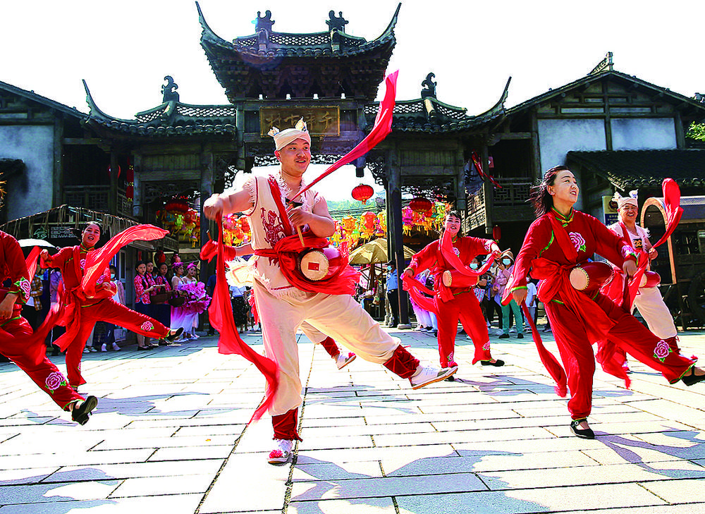 ⑥10月3日,在江苏句容市宝华山国家森林公园,游客观看腰鼓表演。 钟学满摄(中经视觉)