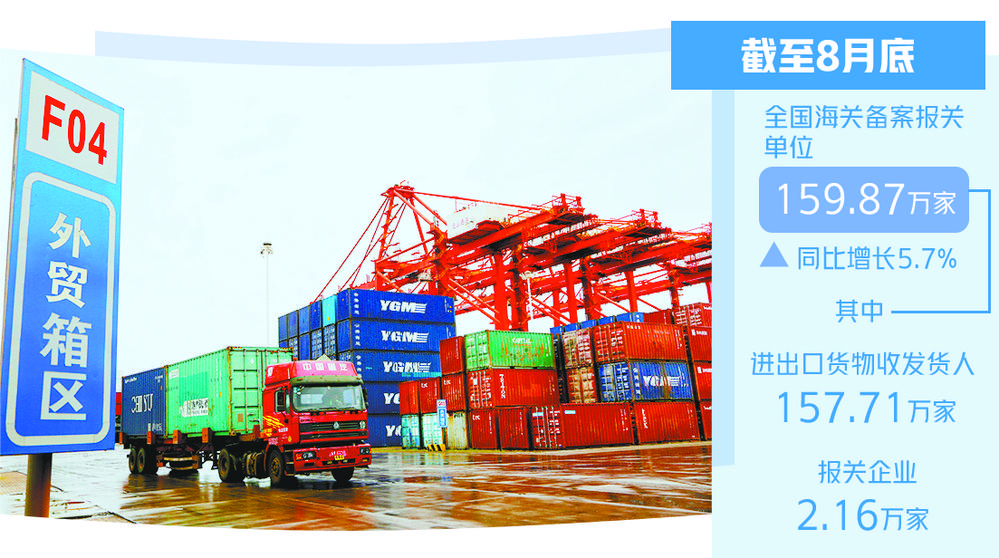 截至8月底,全国海关备案报关单位159.87万家,同比增长5.7%。其中进出口货物收发货人157.71万家,同比增长5.58%;报关企业2.16万家,同比增长15.89%。