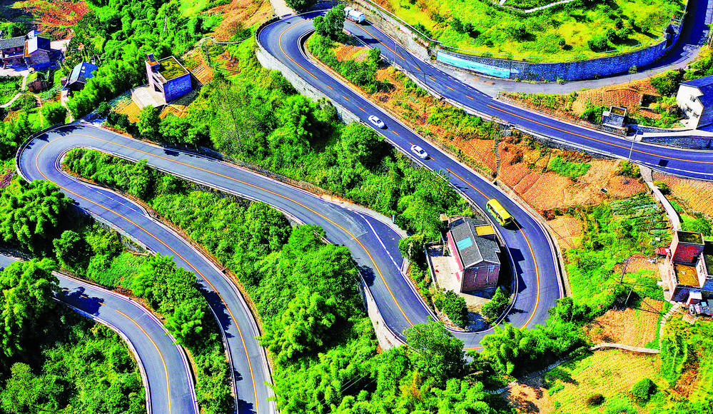 10月8日,公交客车行驶在重庆万盛经开区万东镇五和村乡村盘山公路上。近年来,重庆万盛经开区大力推进美丽乡村和“四好农村路”建设,开通“一元公交”客运村村通,让各个行政村和村民小组之间串连起来,助力农民增收致富。