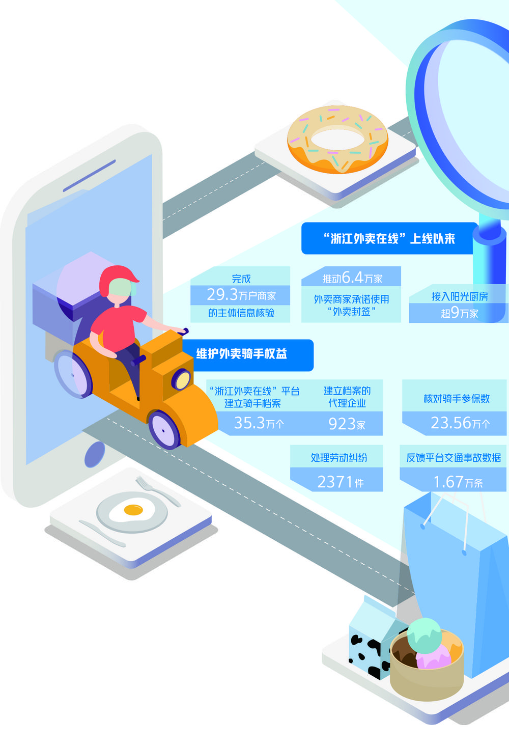 目前,“浙江外卖在线”平台已分别建立骑手、代理企业档案35.3万个、923家,核对骑手参保数23.56万个,处理劳动纠纷2371件,反馈平台交通事故数据1.67万条。