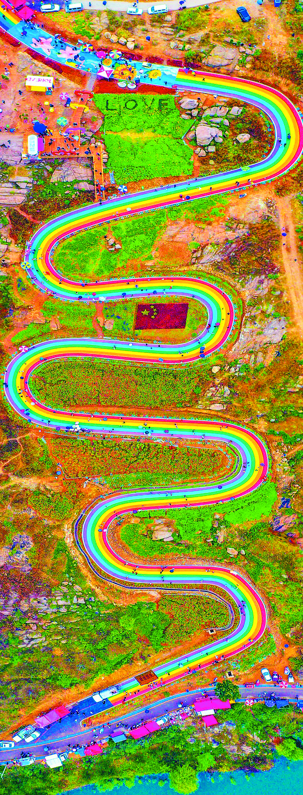 ▶10月7日,游客在山东枣庄市山亭区冯卯镇岩马湖畔九曲花海景点游玩。国庆长假,乡村生态游备受欢迎,各地多举措吸引游客。宋海存摄(中经视觉)
