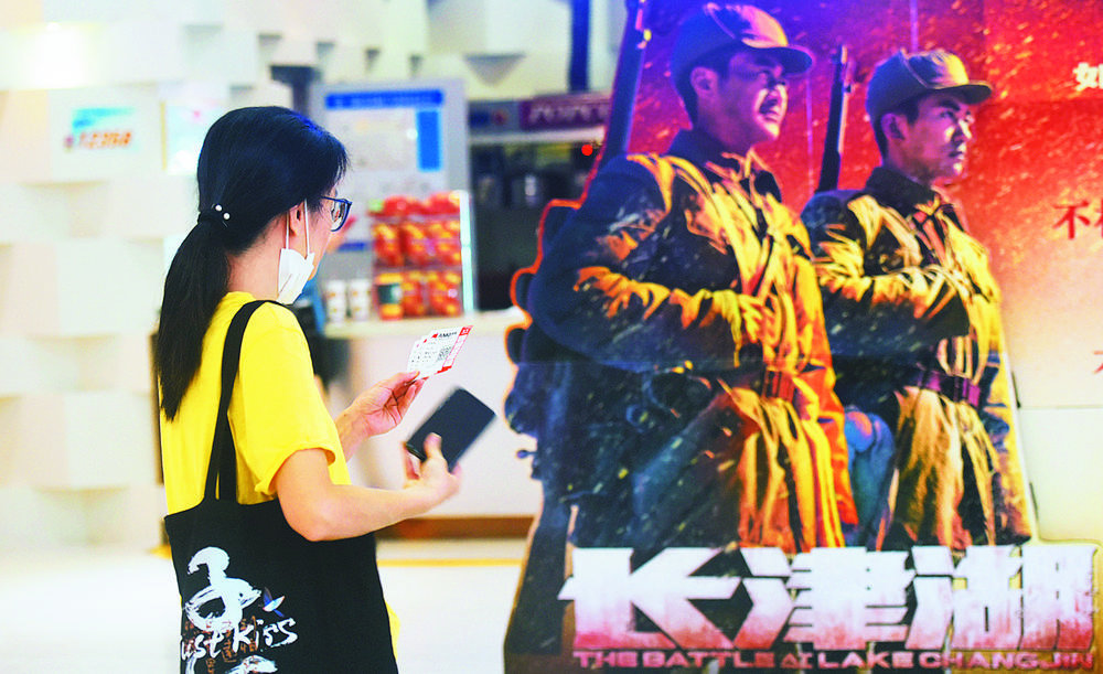 ▲10月7日,观众手拿电影票从浙江杭州一家影院的《长津湖》宣传海报前走过。在《长津湖》等主旋律影片带动下,电影市场国庆档票房持续走高。龙 巍摄(中经视觉)