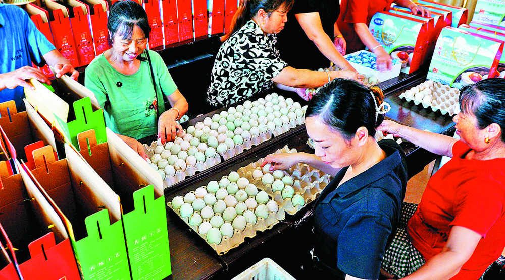 ▶10月5日,江西鹰潭市余江区中童镇鸭塘村,村民在给游客装箱采购的咸鸭蛋。随着农村物流和商业设施不断完善,农村消费市场呈现出网购高频化和消费升级的双重趋势。 翁龙贵摄(中经视觉)