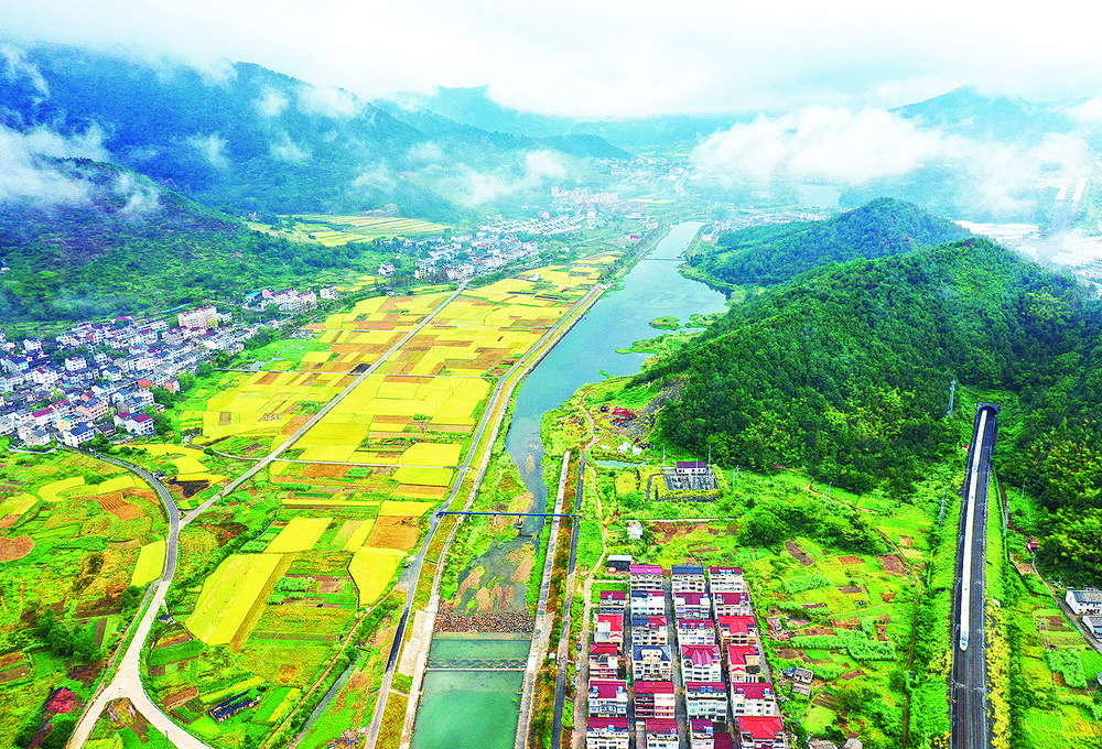 近日,浙江省台州市三门县亭旁镇的金色田园景美如画。金秋十月,晚稻进入丰收期,与伸向远方的高铁沿线、乡村公路,溪河两岸的村庄交相辉映,美不胜收。