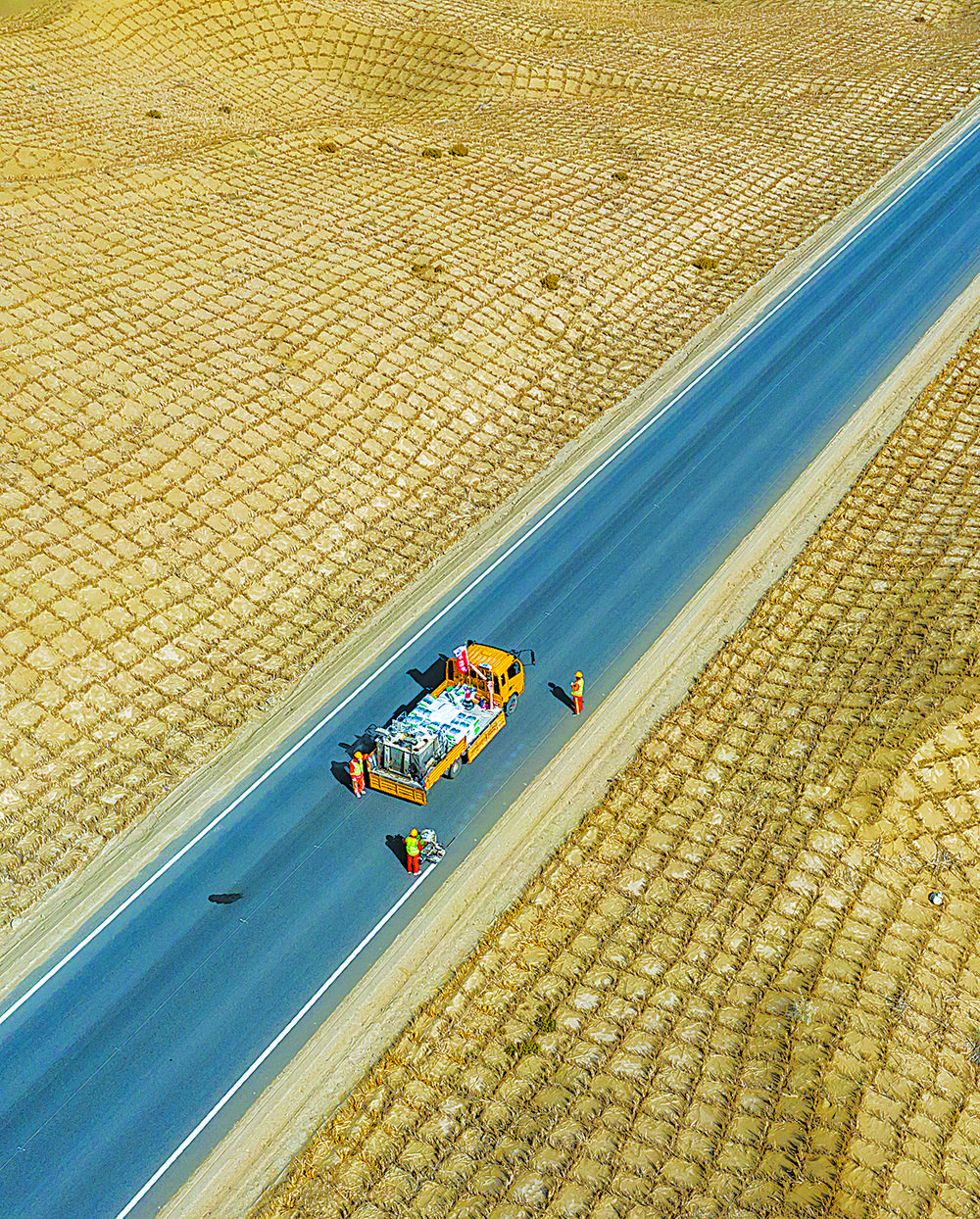 10月13日,在新疆第三条沙漠公路(尉犁至且末沙漠公路)K034段,施工人员正在进行道路标线作业。该公路建成通车后,且末县至库尔勒行车时长将缩至6小时,对推动沿线旅游发展和资源开发产生积极影响。李 飞摄(中经视觉)