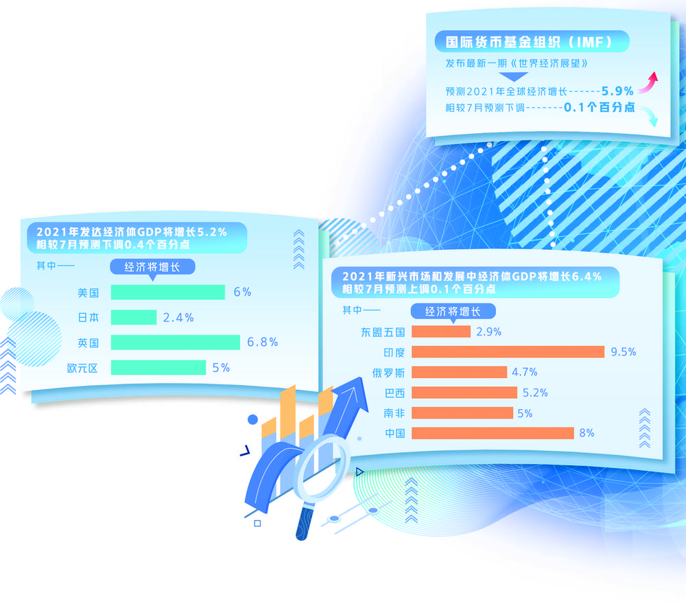 2021年新兴市场和发展中经济体GDP将增长6.4%(上调0.1个百分点),其中东盟五国(印度尼西亚、马来西亚、菲律宾、泰国和越南)将增长2.9%(下调1.4个百分点),印度经济将增长9.5%(没有变化),俄罗斯经济将增长4.7%(上调0.3个百分点),巴西经济将增长5.2%(下调0.1个百分点),南非经济将增长5%(上调1个百分点)。预测中国经济2021年将增长8%,较7月预测微幅下调0.1个百分点。