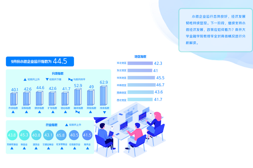 9月份,小微企业各分项指标指数呈现“六升一平一降”态势。其中市场指数为40.1,上升0.2个点;采购指数为42.6,上升0.3个点;绩效指数为44.6,上升0.2个点;扩张指数为42.6,上升0.1个点;信心指数为41.7,上升0.2个点;融资指数为52.9,与前月持平;风险指数为49,上升0.1个点;成本指数为62.9,下降0.2个点。