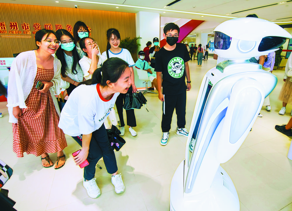 ▶广西梧州市党群服务中心,智能“管家”机器人与市民互动交流。目前,AI+政务服务的模式已成为趋势,以智能化、自动化技术协助便民服务,既让群众办事更便捷,又让政务服务更智慧,真正将惠民便民落到实处。 何华文摄(中经视觉)
