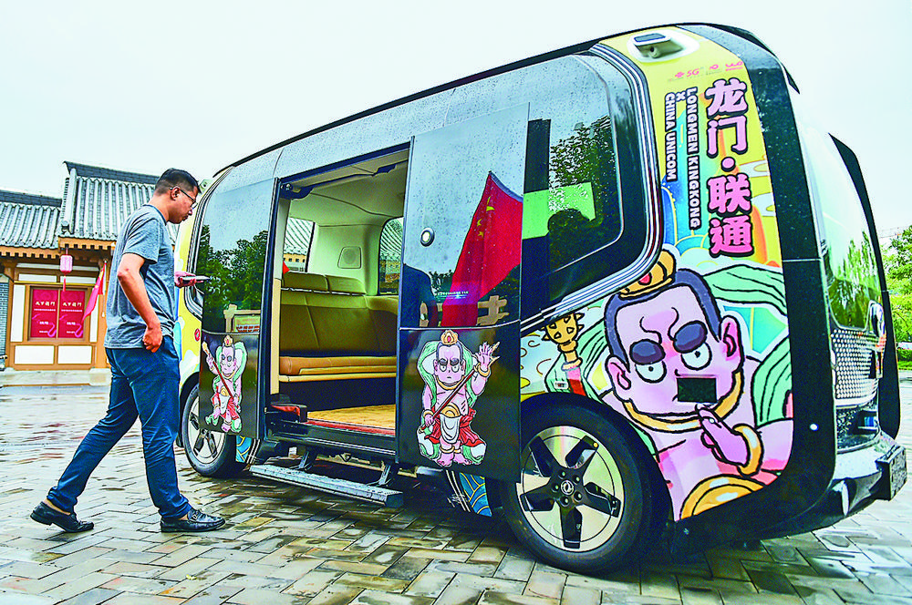 ▼河南洛阳市龙门石窟景区,游客体验5G“无人驾驶车”。数字技术的大量应用推动了文旅行业的数字化转型。黄政伟摄(中经视觉)