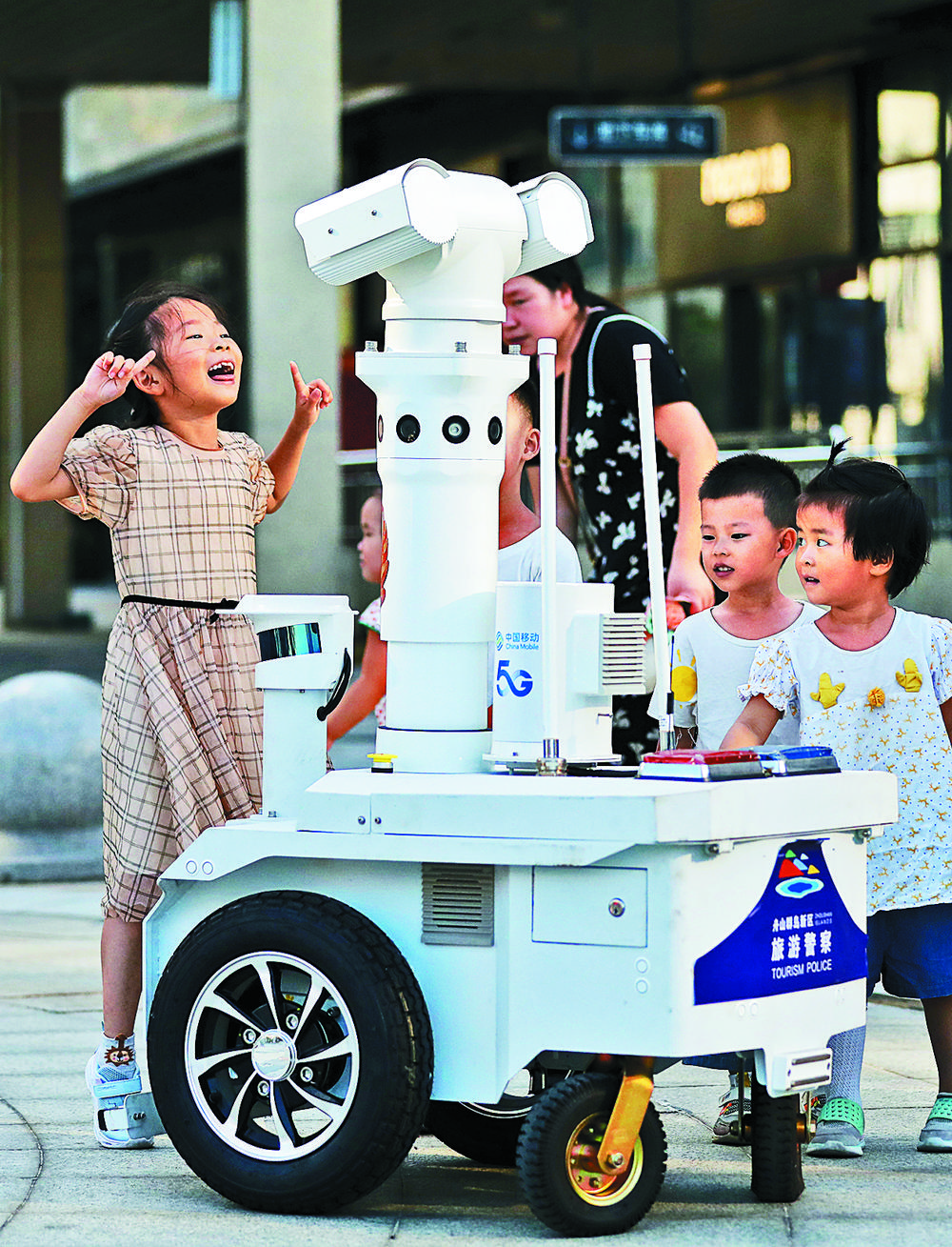 ▲浙江舟山市普陀区,小朋友被5G“机器人警察”吸引。“机器人警察”可以帮助民警完成基础性巡逻值守等工作。邹训永摄(中经视觉)