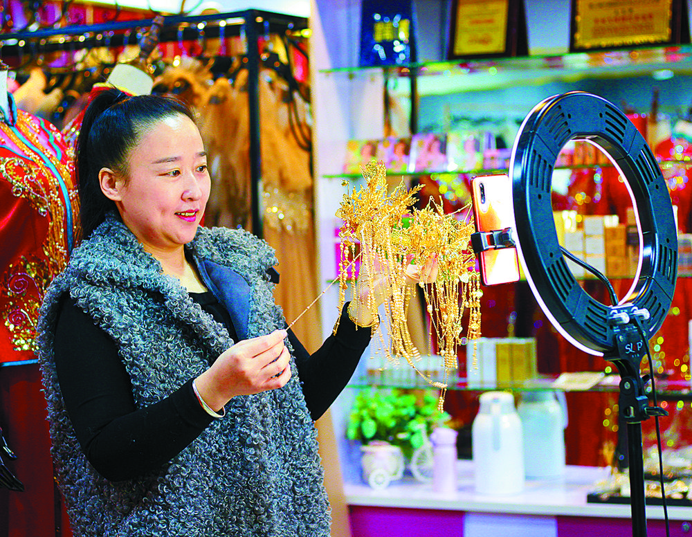 ▲河北保定市亨佰丽小商品批发城的商户通过直播销售头饰。如今,越来越多的消费者选择在直播平台购物,以直播电商为主的“宅经济”正成为新的经济增长点。史红仙摄(中经视觉)