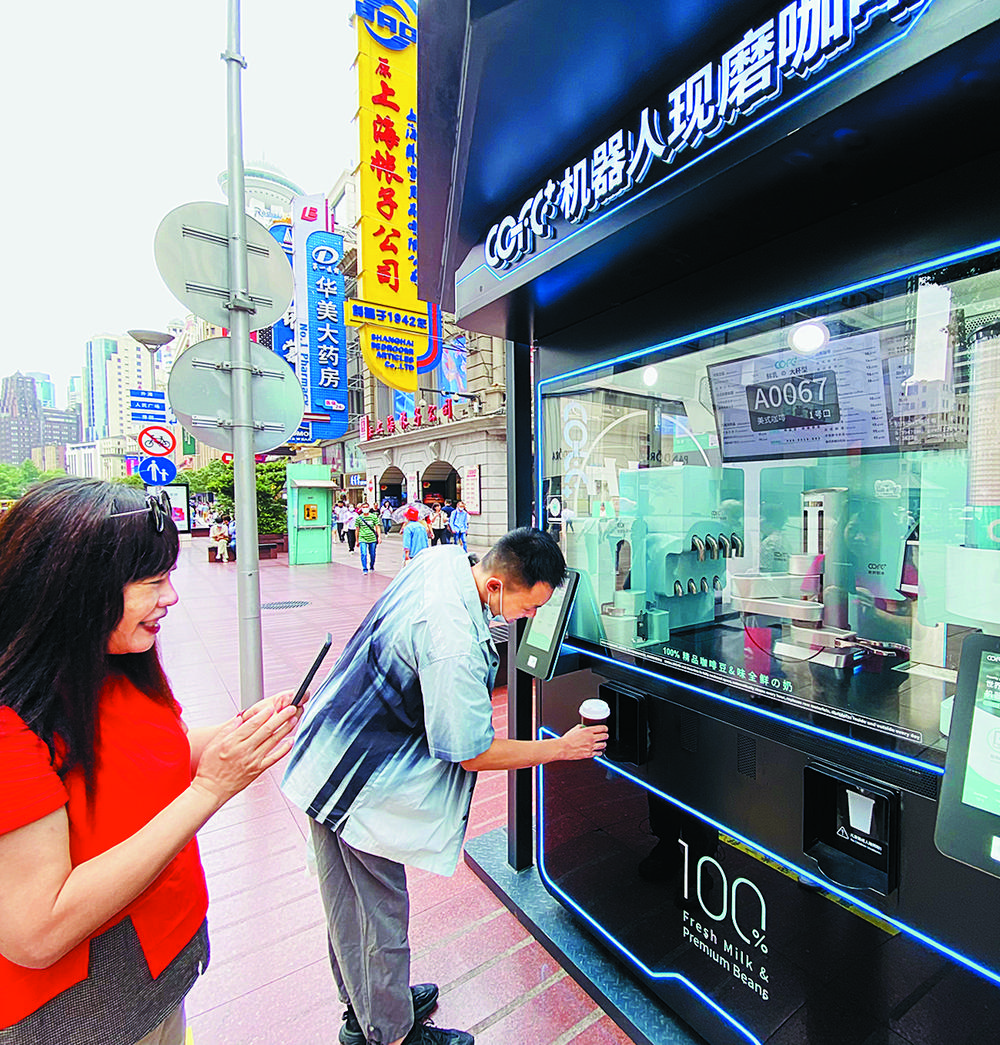 ▲游客在上海市南京路步行街上的机器人咖啡亭购买现磨咖啡。这种智能化“无人店铺”,可以实现365天、24小时全天候无人售卖,为游客提供方便、快捷的购物体验。种 楠摄(中经视觉)