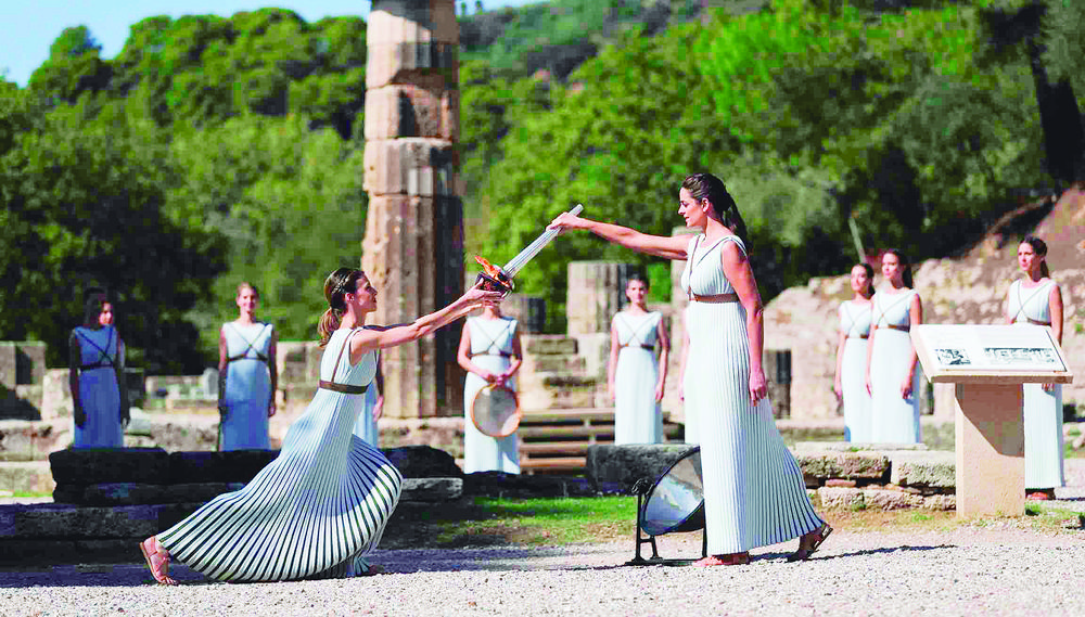 左图 10月18日,扮演最高女祭司的演员乔治乌(右)取得圣火。当日,北京冬奥会火种在希腊古奥林匹亚采集成功。新华社记者 郑焕松摄